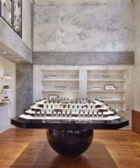 Diptyque Paris has opened a new flagship on Madison Avenue on the Upper East Side of Manhattan. “With this transformation, we bring Diptyque’s brand journey to life, and confirm our commitment to providing exceptional client experiences,” says the brand’s CEO Fabienne Mauny. “We’ve enhanced the beauty of this emblematic address with stunning architectural and artistic details, inspired by the iconic landmarks of New York City. As our largest store in the United States, it stands as a testament to our dedication to taking the brand to new heights.” The newly-designed Diptyque Paris boutique boasts archways, stained glass windows, concrete, wood and glass, straight lines, circles and color palette of white, green, orange and brown. The brick façade with restored mosaic decorations gives way to interiors that resemble a light and airy apartment organized around two distinct spaces. Toward the front of the boutique is an open two-story space featuring a sculpture-like chandelier of glass globes is suspended over a table by Kelly Wearstler. The fragrance and candle collection are showcased on tables while a double-height bookcase highlights a selection of accessories and scented objects. A wood-paneled salon with a large dining table and fireplace is dedicated to the home and decoration collections while a bath salon (dedicated to the Art du Soin collection) is centered around a mirror surrounded by veneered furnishings with decorative elements.