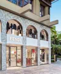 Italian heritage brand Fendi has opened a new boutique at Waikiki’s Royal Hawaiian Center in Honolulu. The a 3,186-square-foot space showcases men’s and women’s leather goods, accessories, ready-to-wear clothing and shoes. Honoring the Roman roots of the Maison, the façade features handmade concrete palm tiles, which recalls the arches of Fendi’s headquarters at Palazzo della Civiltà Italiana. Upon entering, guests are welcomed to the first floor of the multi level boutique, which features the brand’s iconic bags on travertine shelves. The first floor’s men’s universe features green and camel tones, characterized by a curated mix of furniture and palm tiles alongside wooden and raffia elements. Hawaiian Acacia koa wood enriches the space with an exquisite staircase enhanced with a special wall in striped travertine with inserts of the label’s FF codes in red travertine. On the second floor, Patagonia marble and concrete flooring is covered by handmade agave fiber carpets in golden hues, plaster walls are complemented by silver and champagne metal display and shoes are presented on marble shelves. The space is enriched by a dedicated seating area with Fendi Casa furniture, that plays into the raffia and wood accented environment.