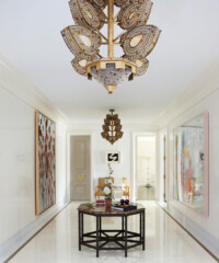 In keeping with the classic contemporary feel, Aman’s partner John Meeks created bespoke embroidery designs for the textiles. Several light fixtures and pieces of furniture were also custom designed. In the bedroom, where a Will Cotton portrait hangs on one wall, a whimsical silver-leaf four-poster bed with a celadon horsehair headboard claims center stage, its palette echoed in a pale blue chair and draperies, with silver-leaf tea paper on the walls giving the room a pearlescent, restful aura. As Aman points out, “We wanted a flow, but it was also really important that each room have its own personality.” Personality, indeed.