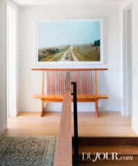 Greene’s interiors were inspired by the homeowner’s personal style and the architecture designed by Barbara Callas of Callas Architects. “She is one of the coolest women I know,” he explains. “Full of warmth, very stylish and extremely well-edited, but all in an easygoing and natural way.” The modern architecture, by comparison, was strong and angular, so furnishings needed to be softer but hold their own in the space. A lot of dark walnut was used in stairs, soffits, walls and millwork, and the window frames are black, so Greene used a mix of neutrals with bold solid colors. With all that black, the fear was that the rooms would be too heavy, but white shades and clean furniture staved off that pitfall. “Objects, art and accessories were ways to bring in more of a handmade, bohemian feel to soften the modernism,” says Greene.